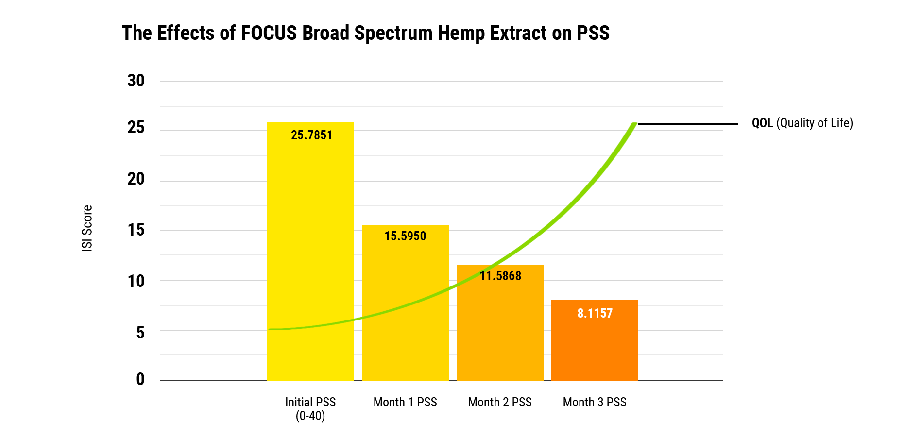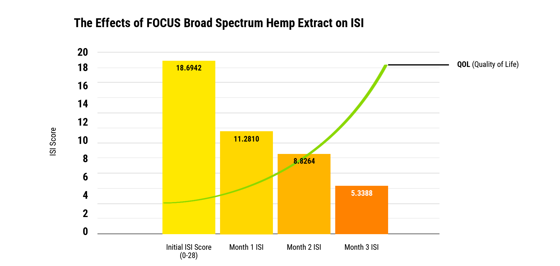 To analyze improvements in sleep, we used the Insomnia Severity Index. The Insomnia Severity Index (ISI) is a brief screening assessment tool designed to evaluate sleep problems. It was developed by Charles M. Morin, Ph.D., Professor of Psychology at the Université Laval in Quebec City, Canada and a world leading authority on insomnia and its treatment. The ISI is one of the most widely used assessment instruments in clinical and observational studies of insomnia.This index is a quantifiable measurement that has been utilized widely as a tool for insomnia measurement. Furthermore, this scoring system is a standard of care in the analysis of sleep. The ISI is a classical assessment tool used in neurology as a standard of care in monitoring sleep issues. Upon a chart review, we looked at 121 patients who were instructed to use FOCUS daily. We looked at the ISI scores at baseline, then provided patients with follow up ISI questionnaires at months one, two, and three. Patients were instructed to use FOCUS at 1 mL once per day in the morning. All collection of data was recorded via telephone with verbal instructions.